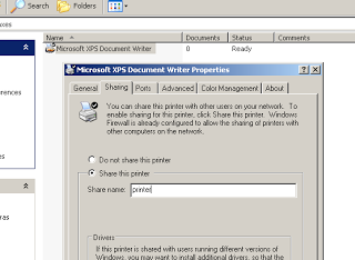 First, prepare the target by sharing a printer. Here you can see I have shared the default "XPS Document Writer" printer.