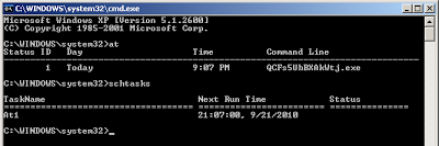 At this point, you can run "at" or "schtasks" on the target machine to see if it worked. You should see something like this:
