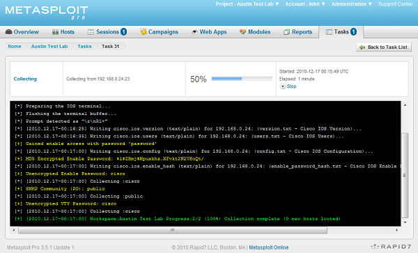 Metasploit Express and Metasploit Pro can automatically recycle credentials obtained from these configuration files to gain access to other devices on the network. If you crack one Cisco device through a weak SNMP community and discover that the vty password is "ciscorules!", you can use the "known-only" profile of the brute force component to automatically try this password, via any protocol, against any other device on the network. Once you gain access to other devices, the configuration files are obtained and the entire process starts again. You can easily apply a password taken from a Cisco router against the login page of an intranet site or leverage a password obtained through a traditional exploit to gain access to a multitude of network devices. One of our development goals is to ensure that our users can always identify and exploit the weakest link on a given network.