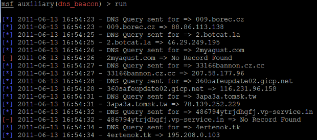 However, in this post I'll concentrate on Abuse.ch's ZeuS Tracker, which has lists of suspicious IP Address and Domain Names. Out of the offered blocklists, we'll be using the ZeuS domain one, which we can use as input for the Metasploit vSploit DNS Beaconing Module. Download this list, remove comments and whitespace, then save it as a text file. At the time of this post the list contained 651 suspicious domains, which of course change from time to time.