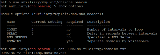 After starting up Metasploit "use auxiliary/vsploit/dns/dns_beacon" and then enter "set DOMAINS file:/tmp/domains.txt":