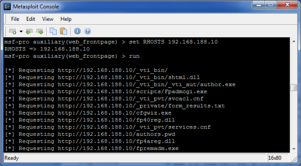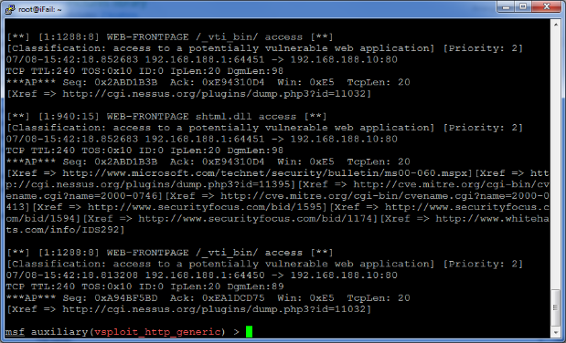 However, not every rule is used in every environment. For example, if you aren't using Microsoft Frontpage on your network, you likely won't want to use Snort's Frontpage rules. On the other hand, if you are running Frontpage you may not want to try exploiting it because it may affect the production system. Because of Metasploit Framework's flexibility, you can use the vSploit Generic HTTP Server module to host a small web server that answers all testing requests, so production systems won't be affected.