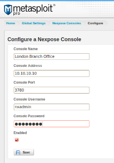 - Integrate with your Nexpose infrastructure: If you have a Nexpose vulnerability managment infrastructure in place, especially if they comprise several scan engines located on various sites around the globe, your best option is to integrate Nexpose directly with Metasploit. Metasploit can connect with any number of Nexpose consoles to query and import vulnerability reports from the scan engines. The advantage of this option is that you don't have to conduct a new scan and you don't have to manually export/import any files. This feature is exclusive to Metasploit Pro.