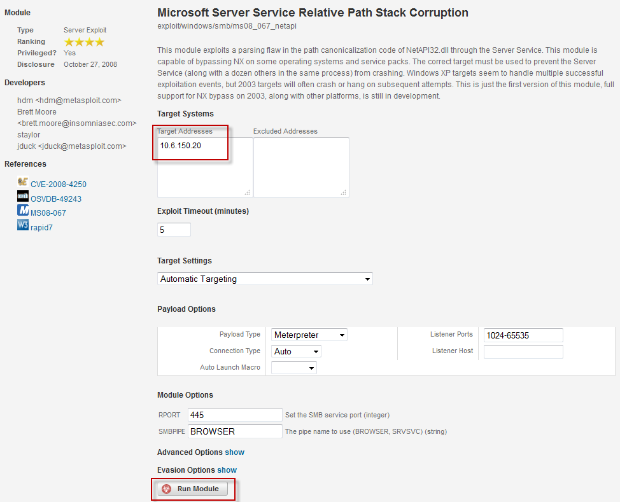 - You'll see the module page for the exploit you have just chosen. The host IP is already pre-filled. Click Run Module