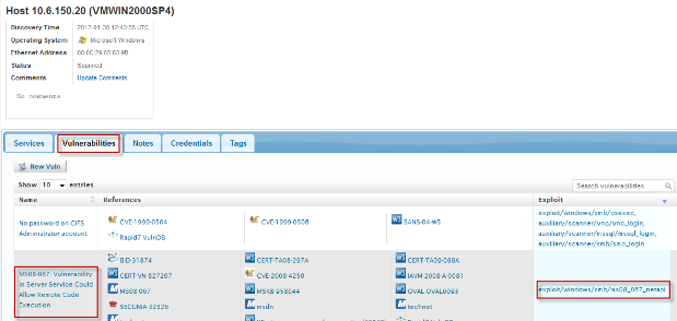 - Click on the Vulnerabilities tab and click on the Exploit in associated to the vulnerability you want to exploit