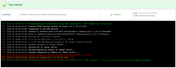 - If the module successfully exploits a vulnerability and creates a session, you'll see:
