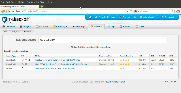 As seen in the screenshot, searching for "EDB-18280" brings up three Metasploit modules that reference that particular Telnet exploit, and "search EDB-18280" in msfconsole returns an equivalent list. For module developers, this can be a quick way to tell if a) a Metasploit module exists for that PoC yet, and if so, b) how Metasploit's implementation differs from the public PoC.