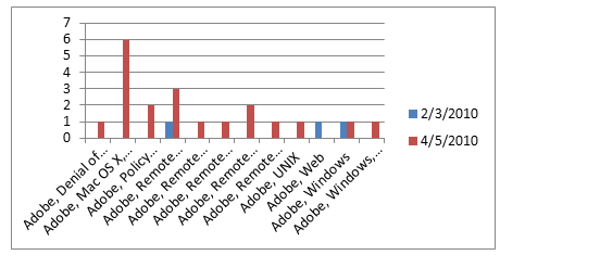 What's the story here? It seems that from 2/3/2009 to 4/5/2010 the total number of Adobe vulnerabilities increased. Analyzing the problem further (i.e.: look at the proof section) will perhaps show you that even though the patches might've been applied, flash wasn't updated and that's the culprit.