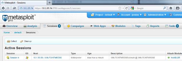 If you have checked all of the above but still cannot get a session, then you should try if your Metasploit installation is set up so that the Metasploit payload can actually connect back to Metasploit after a machine has been exploited. To do this, we'll launch a small executable on the target machine that connects back to Metasploit to create a session. If this test is successful, you'll know that there are no firewalls or configuration issues stopping the payload from connecting back to Metasploit. This test requires Metasploit Pro - if you don't have this version, simply register for a 7-day Metasploit Pro trial to do this test.