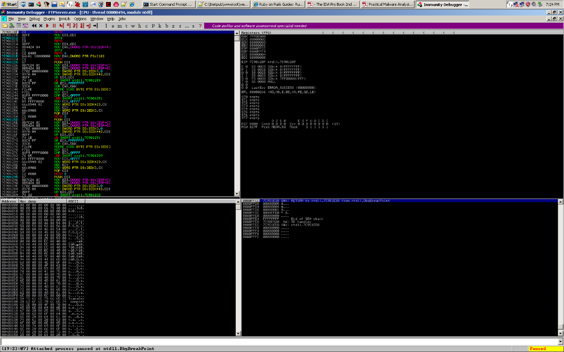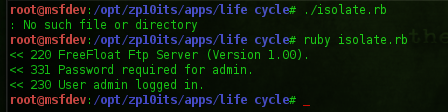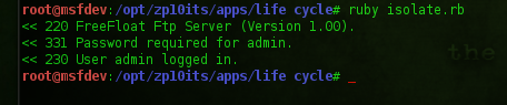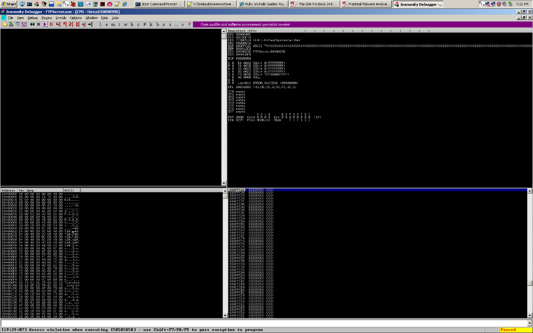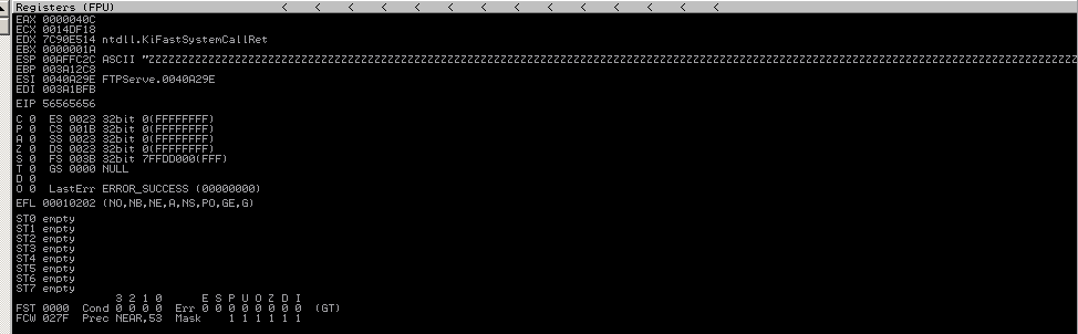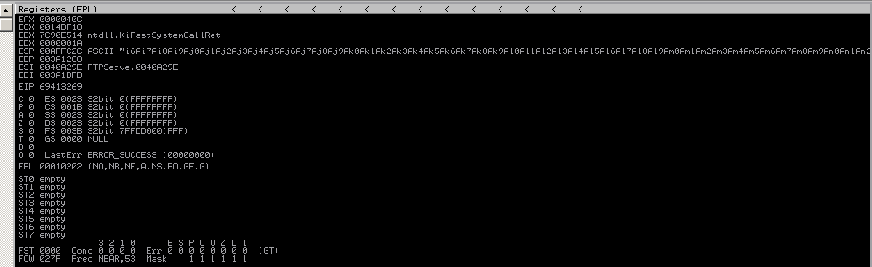Restart the FTP server, and re-attach it to Immunity. Also comment out line 17 in isolate.rb, and uncomment line 22 to begin the pattern analysis buffer string validation. The unique string was generated via metasploits pattern_create.rb script (this can also be done via mona.py (mona.py revolutionized the game).