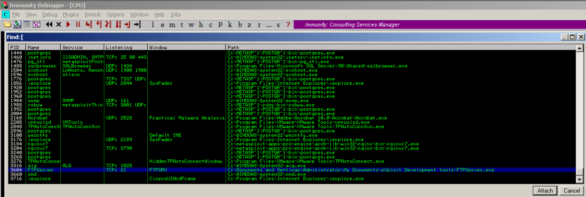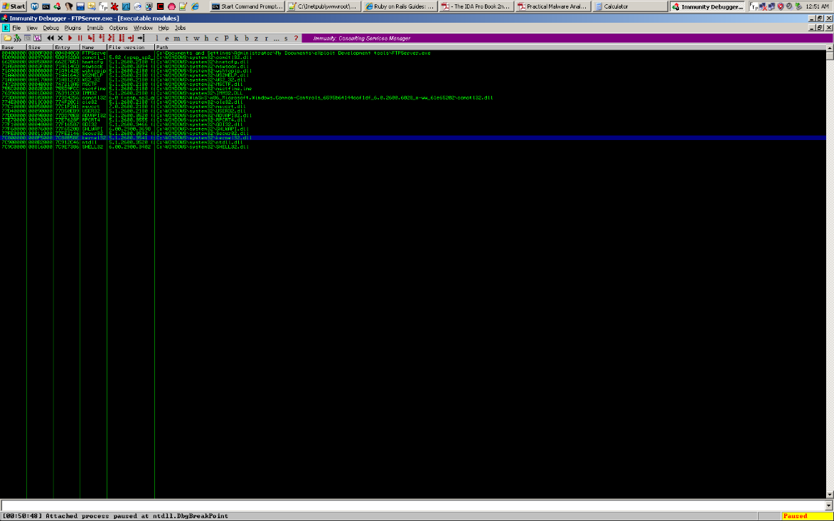 Fire up the FTP Server>Open Immunity>Attach the FTP service>click on the show modules icon or press (Alt E), and select the kernel32.dll module.