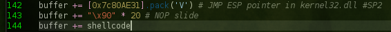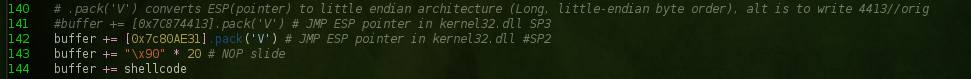 The important item to note here is that we input the enter the jmp esp address as little endian architecture (the order in which the bytes are stored in memory).