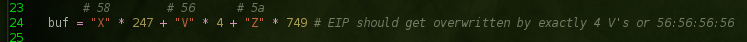 After the execution of our modified isolate.rb script EIP should be overwritten by exactly 4 V's or 56:56:56:56.