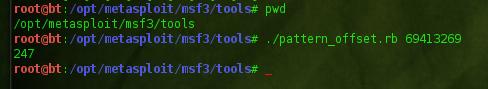 Figure 15: Determined the offset for the four bytes via pattern_offset.rb | EIP = 247.