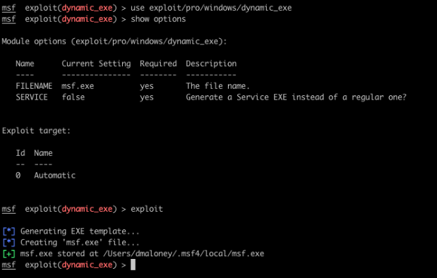 A dynamic EXE can also be generated manually using the exploits/pro/windows/dynamic_exe module. This will generate a dynamic exe on Metasploit Pro's local file system. The payload can then be delivered by various out-of-band methods.