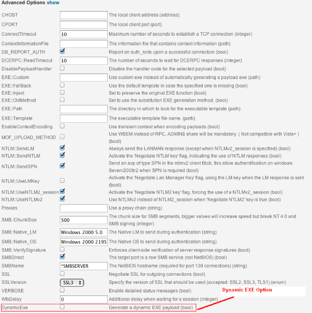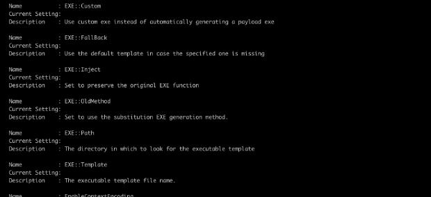 How do we get around this issue? Well the most obvious answer is to use a different executable template. When using an exploit that leverages an executable payload, there are advanced options available for the use of custom templates. To see this, select the psexec module and hit ‘show advanced'. You'll see these options under advanced options: