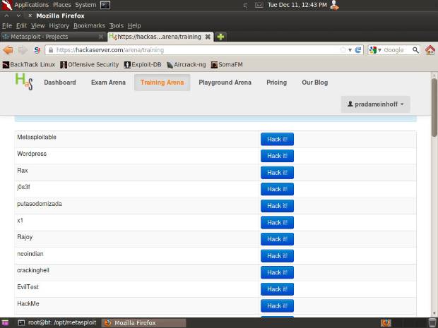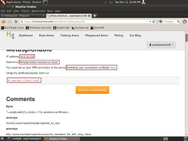 This How-to will use BackTrack5 R3, which is available from backtrack-linux.org, but you should also be able to use any other Linux distribution. I did not see any way on the Hack-A-Server website to get their VPN client working on Windows, so I'd recommend you stick to Linux. I already pre-registered my version of Metasploit on BackTrack for the quick penetration test in the latter part of this post. If you need help, check out this blog post on activating Metasploit on BackTrack5 R3.