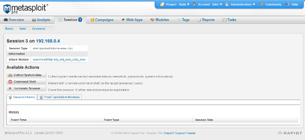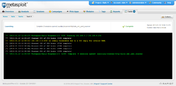 First off, make sure you have a copy of Metasploit and that you have applied the latest update through the web interface. The Metasploit web interface is also a Ruby on Rails application and applying the latest update will ensure that your systems are not vulnerable to attack. Applying the latest update will also ensure you have access to the latest exploits and supporting modules. If you are using a Git checkout of the Metasploit Framework, pull the latest commits from master and you should be good to go. For version 4.5.0, you want to be running update Metasploit Update