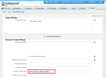 Next we need to identify any web servers within the target environment. Metasploit Pro, Metasploit Express, and Metasploit Community users can use the Scan component within the web interface to automatically discover hosts and services across the network. Console users should leverage db_nmap and the auxiliary/scanner/http/http_version module to locate and fingerprint any exposed web servers. The example below shows how you can configure the Scan component to identify common web server ports. This scan focuses only on ports 80, 343, 3000, 3001, 4567, 8080, 8443, and 3790 in order to reduce the scan time and identify common RoR application ports.