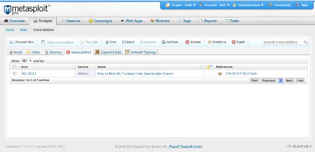 In the output above, we can see that 192.168.0.4 appears to be vulnerable. If a database was connected to the Metasploit console or the web interface was used, there will also be a reported vulnerability for this host. The Metasploit web interface will show something like the following under the Vulnerabilities tab of Analysis.