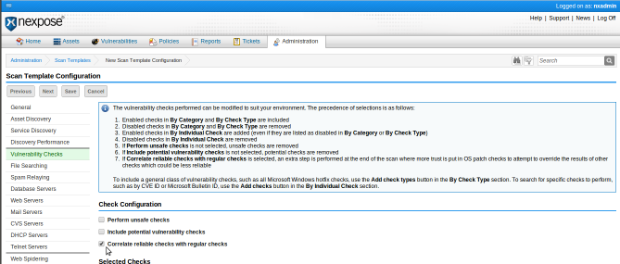 As of the release of Nexpose 5.5.11, released on February 20, 2013, vulnerability correlation is enabled by default in all shipping scan templates except those for PCI. Rapid7 strongly recommends that this be enabled in any existing or future custom scan templates as well, and to enable this please see the documentation on configuring scan templates, or the screenshot below: