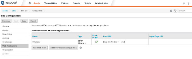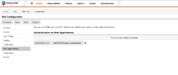 Now that we know that we can use cookies for authentication with this particular web application (Metasploit) we will go ahead and walk through setting up the scan template to do so. The first step is to log into Nexpose and then create a new site or edit an existing site and then select the Web Applications section.
