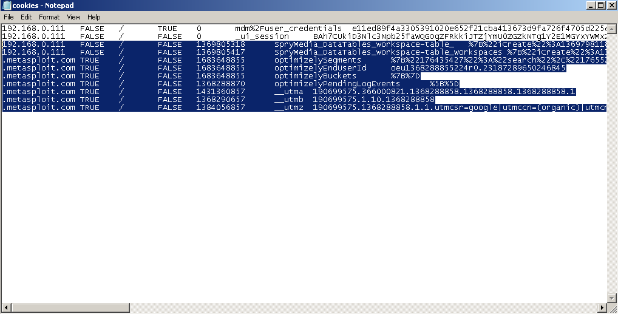 Next we will open the .txt file we created and highlight all the cookies except for the 2 session cookies (since these are what we need to authenticate) and then delete them and save the modified cookies.txt file.