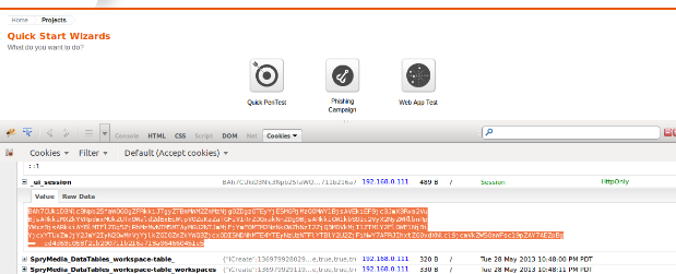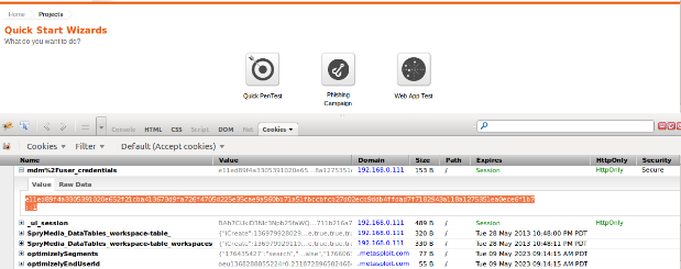 Since we need the 2 session cookies to authenticate with Metasploit we will want to copy the second session cookie value out of Firebug and then single space past the semi-colon that ends the first cookie entry and paste it into Nexpose. So the value for 2 cookie entries will basically be: