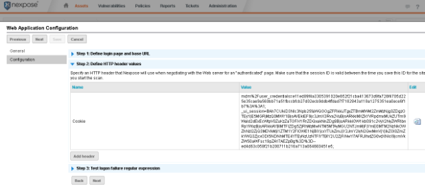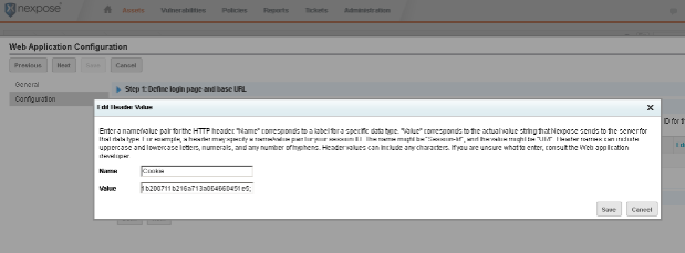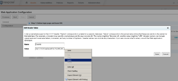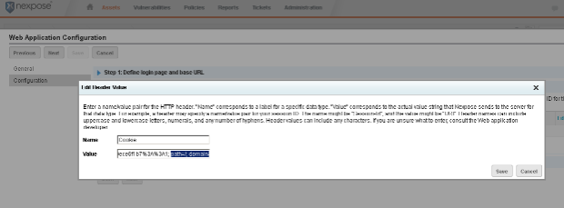 The next screen is where we enter or actual Header value(s). To do this we will basically want to copy the cookie value(s) out of Firebug (after we have logged into the web app) and paste them into the ‘Value' field in Nexpose. Notice we used ‘Cookie' (case-sensitive) for the ‘Name' field.