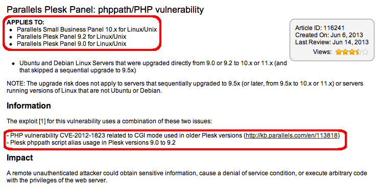 On Jun 06 Parallels created an article on its knowledge database where confirmed the exploit applying at least to Plesk 9.0 - 9.2 on Linux/Unix platforms, and also referencing CVE-2012-1823: