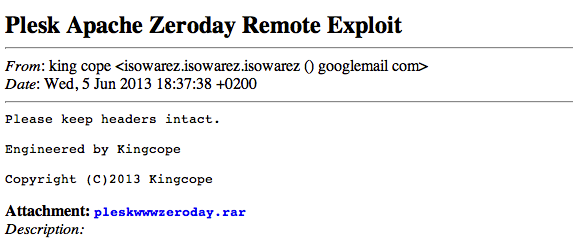 According to Parallels, "Plesk is the most widely used hosting control panel solution, providing everything needed for creating and offering rich hosting plans and managing customers and resellers, including an intuitive User Interface for setting up and managing websites, email, databases, and DNS." (source: Parallels). On Jun 05 kingcope shocked Plesk world by announcing a new 0 day which could allow for remote command execution: