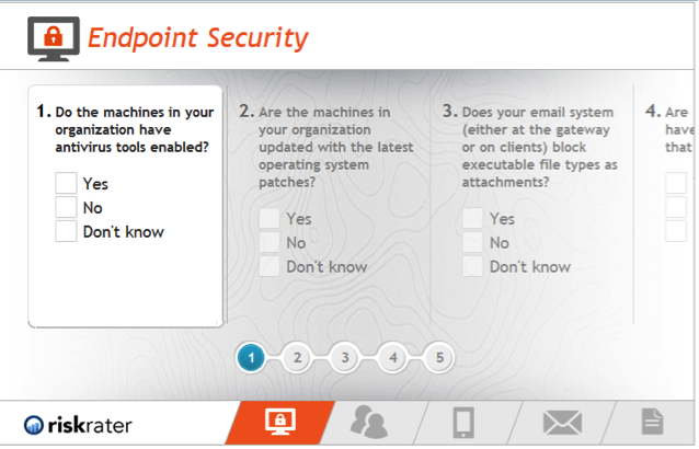 After lurking for a little while, I'm starting to write on SecurityStreet today in order to introduce RiskRater, a tool we've been working on recently. RiskRater is an interactive free tool designed to give security professionals a quick snapshot of how they are doing in terms of their security controls for endpoints, mobile devices and user-based risk.