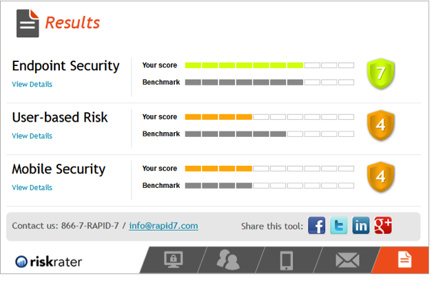 Essentially, RiskRater is a straightforward grading tool focused on security. It poses a number of questions for each of three categories (endpoint, mobile, and user), and calculates a score from 1-10 based on your answers. The scoring is determined using an algorithm we created, and then mapped against benchmarks for the three categories. We developed those benchmarks by working with data collected from our own research, as well as responses from over 600 organizations. Thank you very much to everyone who gave us feedback. We really wanted to create a baseline so users can see how they're doing compared to others, so we greatly appreciate the information you shared with us. As more people use the tool, the benchmarks will evolve to reflect the user base (but no specific or personal attributable information will be shared).