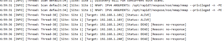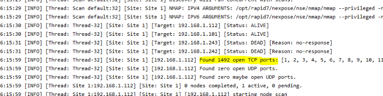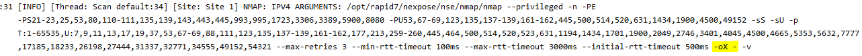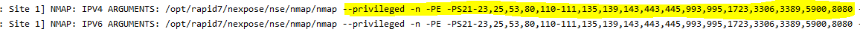 Next, try using the Nmap parameters from your Nexpose scan log so you can reproduce exactly what Nexpose does during discovery. They are usually near the top of the scan log and will look similar to the below image. Click the image to view full-size.