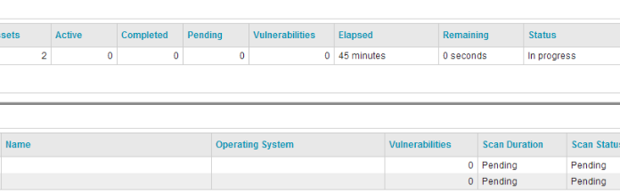 In this situation a scan can be running for many minutes or hours even with a small number of assets to scan. The status for each discovered asset may show a "Pending" status on the scan status page. Typically what's actually happening here is that Nexpose has found the asset(s) to be alive and is continuing with the port scan. Nexpose uses Nmap for the discovery phase and currently it does not output the port scan activity to the scan log; only the summarized results for each asset. Since Nmap performs port scans in groups it will not output the summaries for each asset until the entire group of assets has completed the port scan. When using a scan template that includes all 65,535 TCP ports for service discovery, it can take a significant amount of time to scan and makes this issue more apparent. See the following images for an example of this behavior.