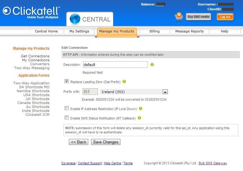 Setup an account with an SMS provider. In this instance I am using Clickatell as they have an API which can accept a HTTP call with URL parameters to initiate an SMS. They offer some initial free text messages when you sign up if you would like to try before you buy. After creating an account, log in to “Developers Central”. In the tab “Manage my Products” add a connection (type http), click submit and then you have your API ID.
