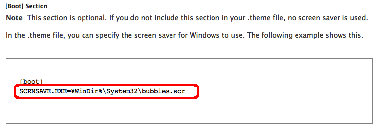 First of all, the bug occurs while handling the [boot] section on .theme files, where an arbitrary path can be used as screen saver: