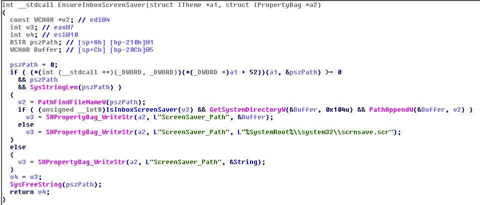 In order to solve it, the Microsoft patch adds a new function, EnsureInfoxScreenSaver(), which tries to verify the screen saver path: