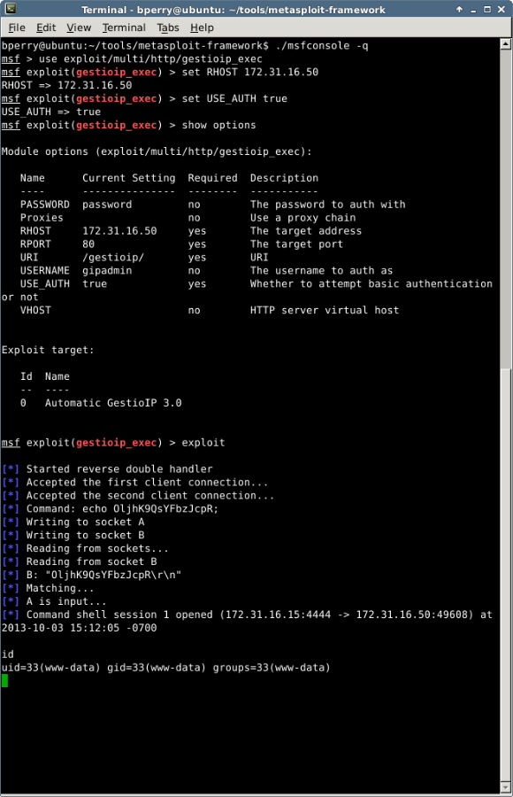Once I figured out how to execute arbitrary commands (and figuring out my payload size couldn't be greater than about 450 characters), I knew how to write my Metasploit module: