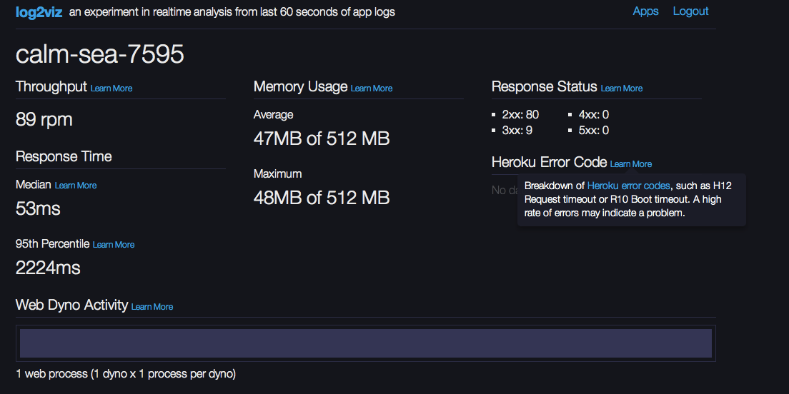 Like all log data in its raw format it’s not massively useful to see metrics getting dumped into your logs every 20 seconds. That’s not exactly what Heroku had in mind, however. At the same time they introduced log-runtime-metrics, Heroku also released their open source log2viz experiment which gives you real time analytics extracted from your logs. Log2Viz gives you a view into what is happening in your app from a performance perspective over the last 60 seconds. For example I can get a view into my app response time and memory usage, as well as any nasty Heroku system errors that may have occurred. I have to admit, that’s pretty neat, and Log2Viz is a great tool to for showcasing the power of combining real-time analytics and logs that contain useful data.