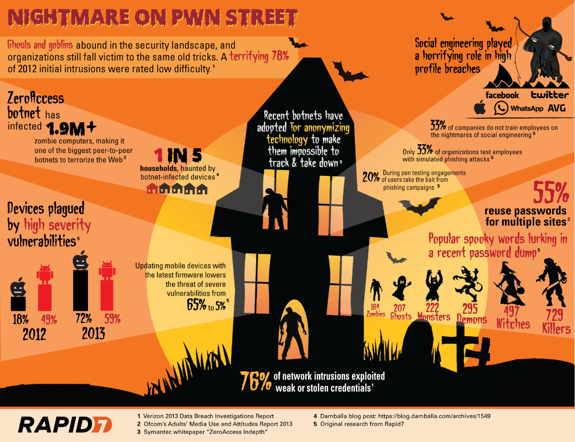 We've gone a little Halloween-crazy this year over here at Rapid7 Towers. Check out this week's Whiteboard Wednesday video to hear how organizations are like the protagonists of horror movies; making decisions that may ultimately make them vulnerable to attack. In addition, while we were carving our pumpkins and sewing our costumes, we got to thinking about one of the most horrifying realities in information security: many organizations keep falling victim to the same tricks they've seen in the past. We saw this reflected in Verizon's 2013 Breach Investigations report, which revealed that a terrifying 78% of initial intrusions were rated as low difficulty, while 75% were considered opportunistic attacks.