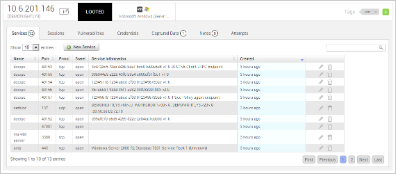 - New screen includes counts/stats for services, vulnerabilities, notes, credentials, captured data, file shares, exploit attempts, and matched modules.
