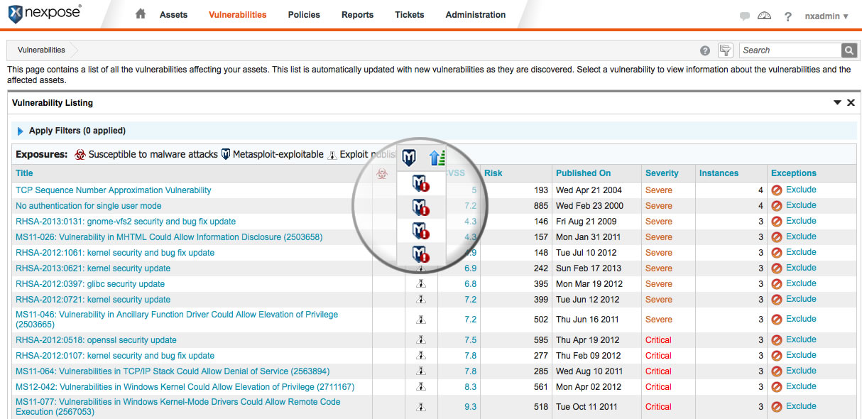 After vulnerabilities have been validated, the results are returned to Nexpose, where exploitability of a vulnerability can be used to create reports and prioritize vulnerabilities for remediation.