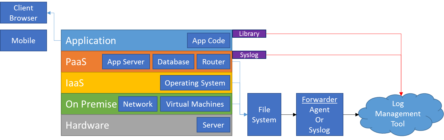 Pretty much all levels of the application stack kick out log data. Different levels, though, lend themselves to different methods of gaining access. That said, there are some similarities across the levels, though.
