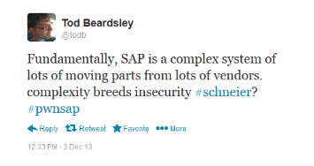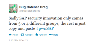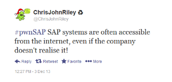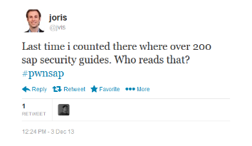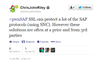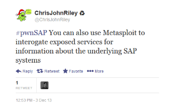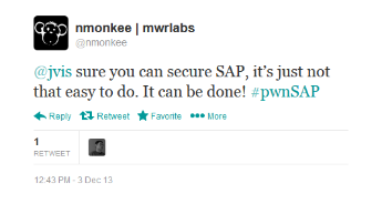 Juan's first question was, “Can you start by telling us a bit about how SAP system hacking has changed lately?” @todb called this research paper, SAP Penetration Testing Using Metasploit – How to Protect Sensitive ERP Data, “the most complete survey on the state of the art on SAP assessment today.” Panelist @ChrisJohnRiley added, “The available tools for probing and testing SAP security have really increased in recent years” and explained that the general complexity of SAP systems means that reconfiguration/patching can be a nightmare – resulting in companies either being constantly behind the current patch level, or just ignoring it as a lost cause.