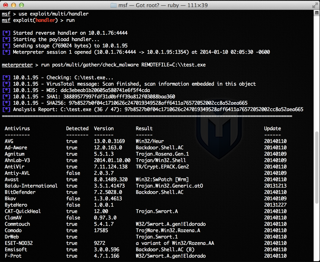 Before you start using these features, note that by default you are using Metasploit's public API key. What does this mean to you? It means as long as you're using the default key, we at Metasploit can see your submission. The data we can see include: The date of the submission, and the web version of the report (which is the same one you have). We don't actually have access to your malware sample. The following screenshot is an example: