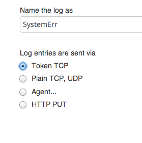 When setting these up via the Logentries UI, choose to ‘add a log’, then ‘manual configuration’, give the log a name and select ‘Token TCP’.