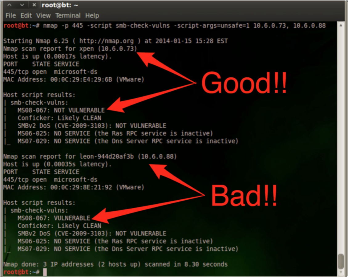 Running Nmap with these flags would indicate if the systems scanned were vulnerable or not. As can be seen in the following screen shot discovering vulnerable hosts is pretty straightforward once the user knows what they are looking for.