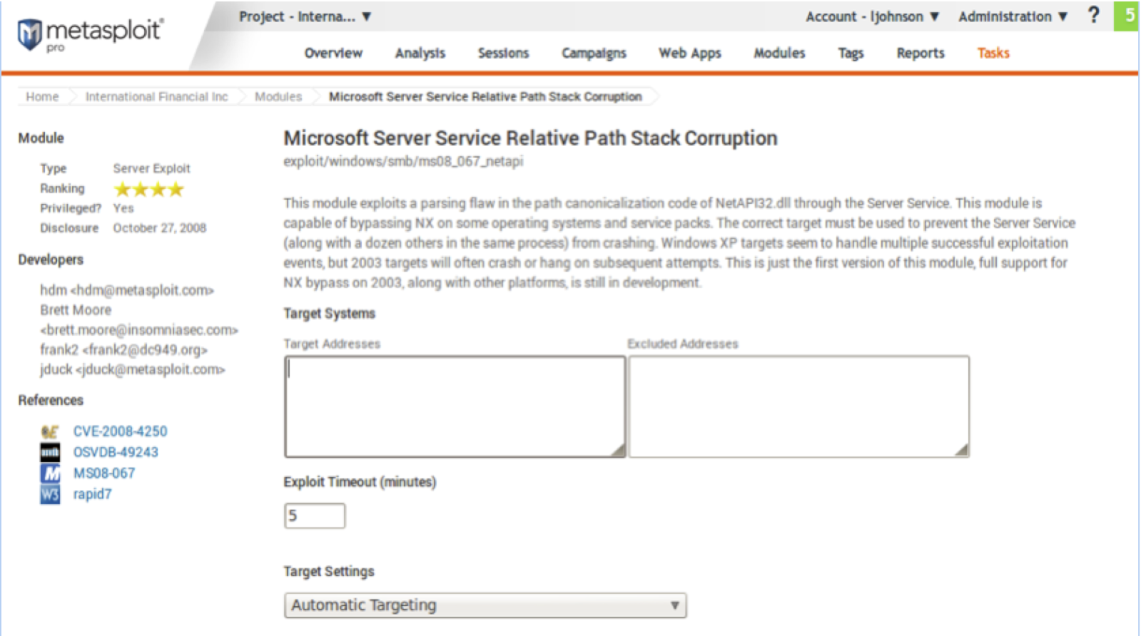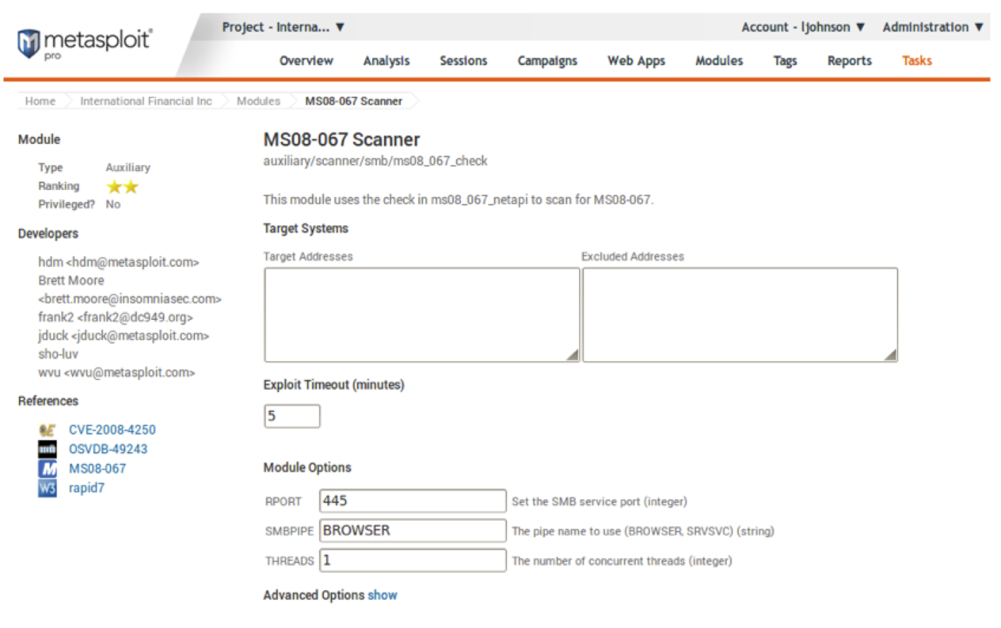 Or if you are less inclined to use the command line and prefer to take the point and click approach you could simply use the same module in Metasploit Pro or Community as the following screen shot demonstrates. All the user needs to do is plug in IP addresses into the Target Address field and run the module, and voila! You too can be a hacker! But wait theres more!
